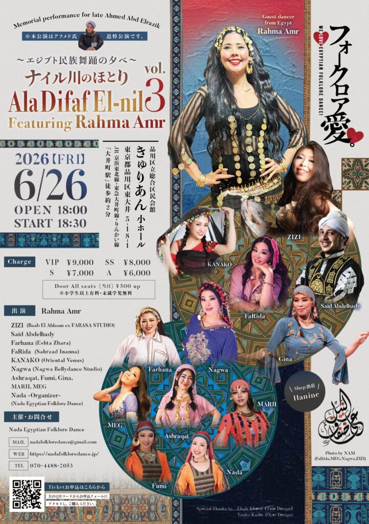 今回はゲストが女性ですので、エジプト女性の感性や表現を存分にお伝えするショーといたします。また、昨秋に急逝したAhmed Abd Elrazik氏も本イベントのゲストで予定されていたことから、本公演はAhmed氏追悼公演になります。Rahma氏のご協力も賜り、同氏作品も複数披露いたします。